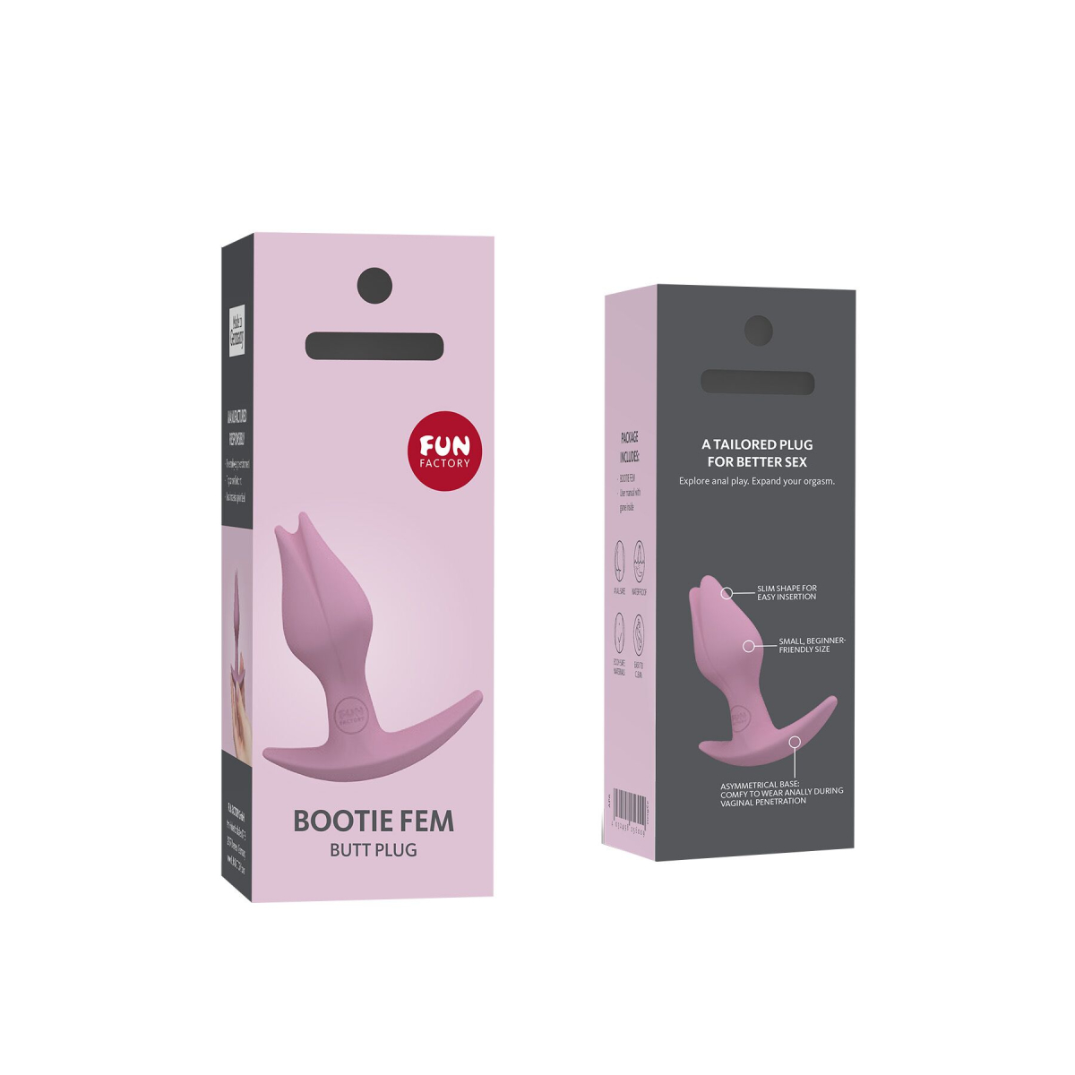 Анальна пробка Fun Factory BOOTIE FEM зручна для тих, хто тільки відкриває для себе світ задоволень від анальної стимуляції. Цікава форма у вигляді напіврозкритого бутона точково стимулює безліч нервових закінчень усередині ануса та навколо нього, даруючи яскраві інтенсивні відчуття. Вузький роздвоєний кінчик, що імітує пелюстки, дає змогу м’яко ввести пробку в анус.