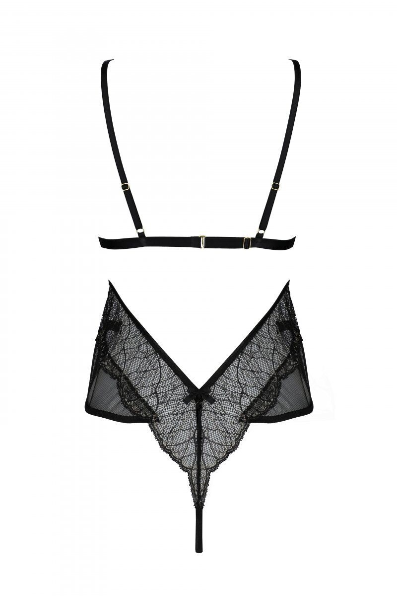 Боді Passion AMBERLY BODY характеризується оригінальним вишуканим кроєм. Трикутні чашечки ліфа з м’якого мереживного полотна підкреслюють природну красу грудей і утворюють чарівне декольте. Ще один ажурний трикутник прикриває верхню частину живота, візуально звужуючи талію завдяки вирізам на боках. Нижня частина з напівпрозорого матеріалу прикриває живіт і стегна, створюючи інтригу в образі. А на сідницях розкіш мережива переходить у тонку смужку стрінгів.