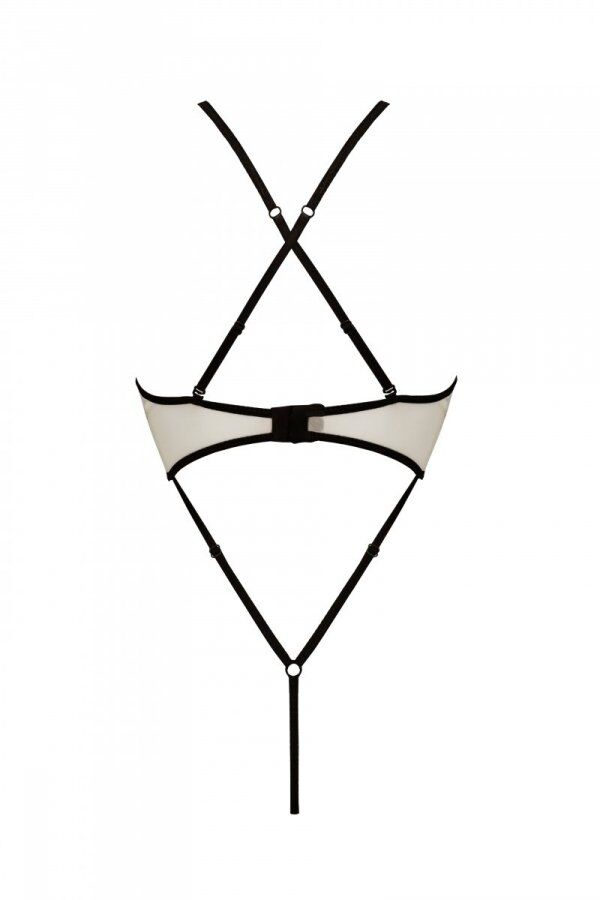 Мереживні півчашки на кісточках шикарно окреслюють груди, залишаючи на очах апетитні частини й лише злегка ховаючи соски. Для кращої посадки бретелі ліфа можна відрегулювати. Екстрависокі вирізи з боків оголюють стегна та частину талії. Спинка боді максимально відкрита: тут є лише застібка ліфа, перехрещені бретелі та регульовані ремінці умовних трусиків. Відкрита промежина — як солодкий сюрприз цієї приголомшливої ??білизни.
