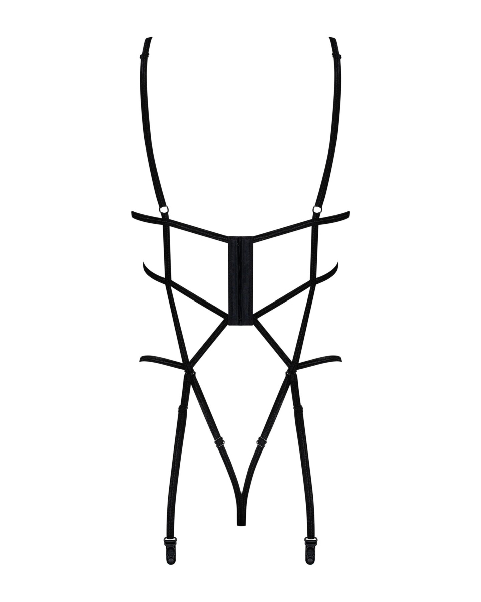 Боді зі стреп з доступом Obsessive Badossa crotchless teddy виконаний з м’яких еластичних регульованих ремінців, тому чудово сяде на будь-яку фігуру. Переплетення стреп створюють образ зухвалий і кричуще сексуальний. Чашки на кісточках красиво окреслюють груди, тонкі м’які смужки лягають із двох боків від сосків так, що неможливо відірвати погляд. Маленька прикраса між грудьми — особливість у цій еротичній пишноті. Ажурне мереживо на тонких бретельках — як прикраса і без того чарівного верху боді. Вертикальні стрепи на животі візуально витягують силует. Еротична западинка пупка веде погляд до призовно відкритої промежини. На спинці боді є широка багаторівнева застібка на гачках. Стрепи умовних стрингів регулюються, як пояс для панчох.