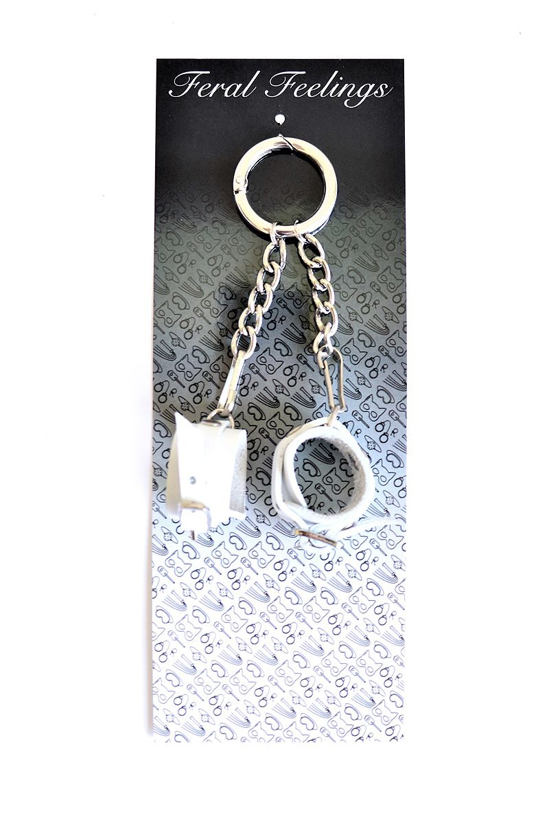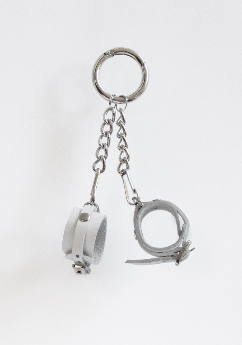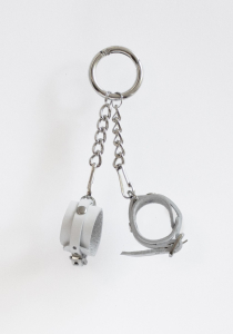 Мініатюрна версія наручників виготовлена ??з натуральної шкіри рослинного дублення. Кожен наручник кріпиться до основного кільця-карабіну ланцюжком і міні-карабіном, тому можна носити тільки один наручник, а другий - подарувати своєму партнеру у якості символу.