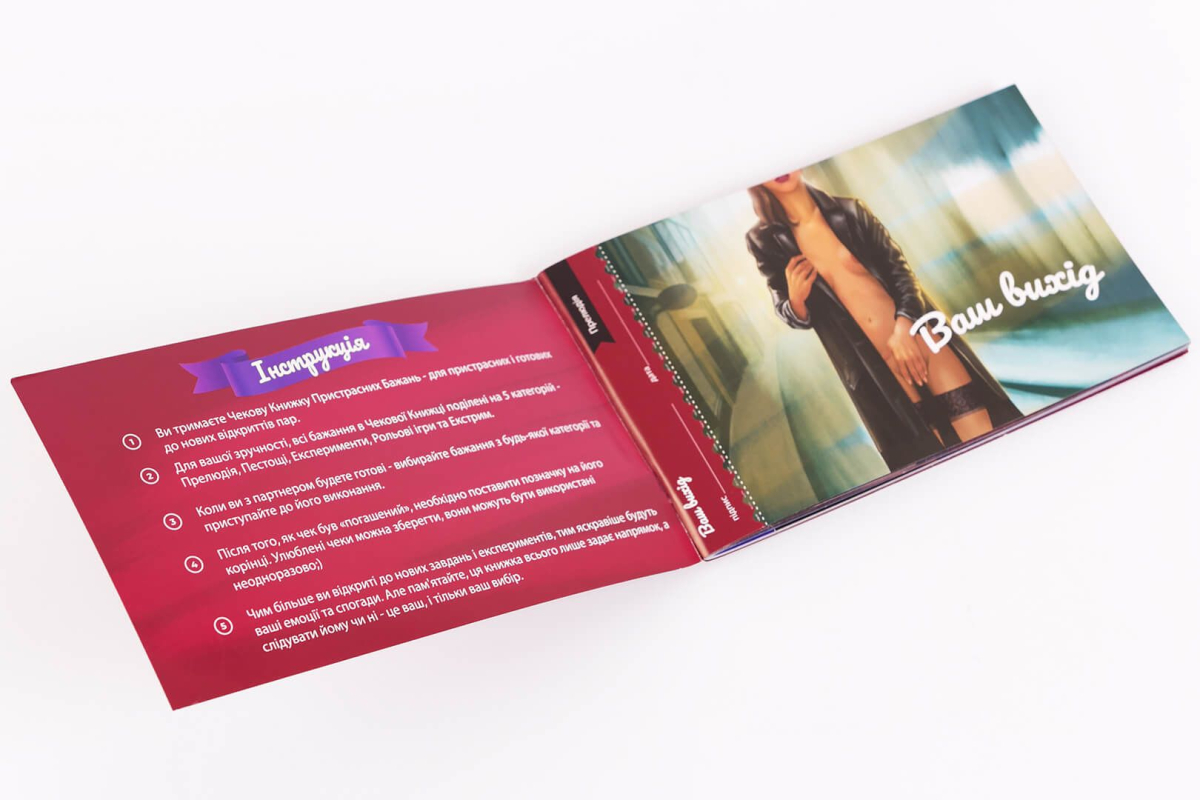 Чекова Книжка Пристрасних Бажань - це ідеальний подарунок для пристрасних і готових до нових відкриттів пар. В Книжці ви знайдете 26 чеків (завдань) різного ступеня відвертості.