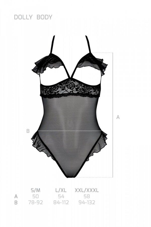 Еластична сітка еротичного боді Passion DOLLY BODY ідеально лягає на живіт та низ спинки. Сітчасті волани з бокового краю стегна мають чарівний вигляд. Оздоблення з широкого мережива підкреслює груди. Зухвало відкриті чашки ліфа зверху прикриті рюшами. О, цей ліф зведе вашого партнера з розуму! Для найкращої посадки бретелі ліфа можна відрегулювати. Ця прекрасна білизна стане справжнім фурором на вашому інтимному побаченні!