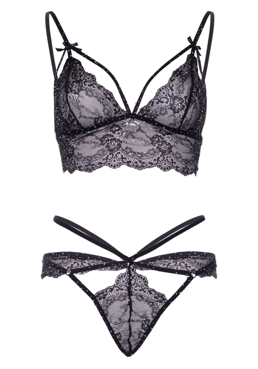 Готуйтеся грати та спокушати! Пропонуємо купити комплект бра + стрінги зі стрепами та стразами Leg Avenue Ready Or Not — неймовірно сексуальний і водночас зручний, який стане вашою улюбленою білизною для особливих випадків. Він поєднує в собі мереживо, стрази та стрепи, створюючи жіночний образ.