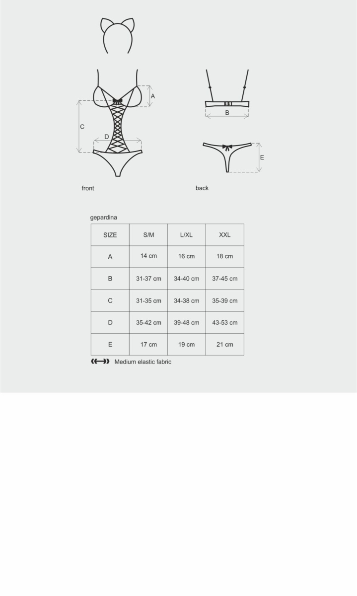 Монокіні виконаний з м’якого стрейчевого матеріалу з принтом-плями, що нагадують граціозного гепарду. Чашки на кісточках відмінно підтримують і підкреслюють груди, я м’яке хутро поверх ліфа виглядає чудово. Червоний бантик між грудьми акцентує увагу на спокусливих опуклостях. Прикраса у вигляді шнурівки від бюстгальтера до трусиків створює враження утяжки і візуально стрункіша силует. Тонкі лямки та багаторівнева застібка на спинці допоможуть відрегулювати монокіні під фігуру. Трусики танга з сіточки з гепардовим принтом красиво сідають на стегна і звабливо відкривають пружну попку. Червоний бантик ззаду на трусиках приваблює захоплений погляд. А знімний пухнастий довгий хвостик можна використовувати для сексуальних ігор та втілення найсміливіших фантазій. Симпатичні вушка, що входять до комплекту,