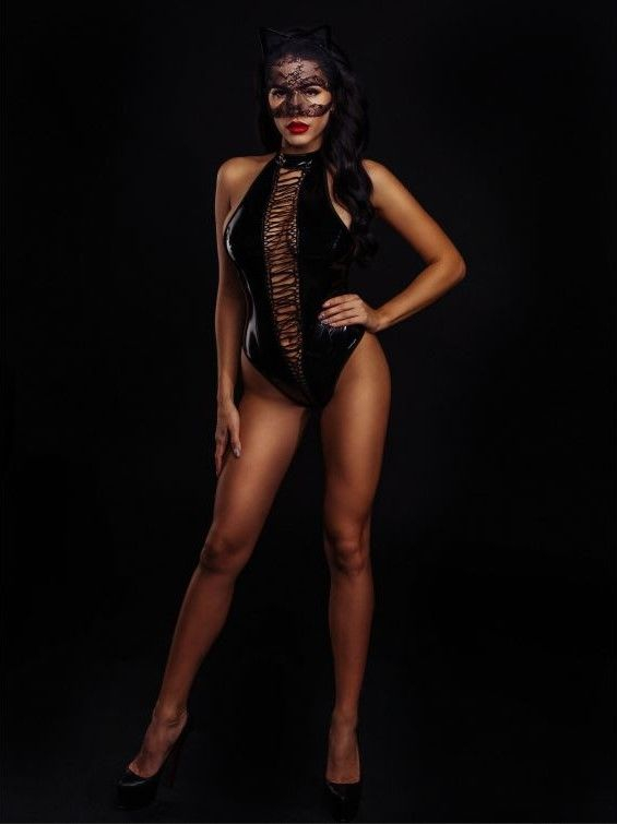 Максимально відкрите, з одного боку, при цьому найпікантніші деталі залишаються прикритими - все можливо з цим костюмом! Лаковий боді щільно облягає фігуру, високі вирізи з боків візуально подовжують ноги, а шнурівка попереду додає еротизму. Костюм складається з: