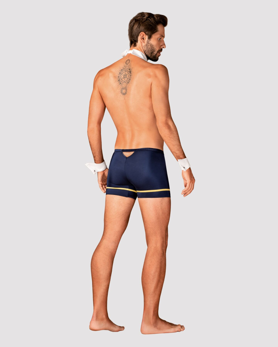 Еротичний костюм пілота з окулярами Obsessive Pilotman set виготовлений із м’якого, приємного до тіла еластичного матеріалу. Боксери красиво лягають на стегна, підкреслюючи сідниці та інтимні місця. Синій матеріал із золотою обробкою та схожим на крила логотипом нагадують про романтику польотів, а виріз ззаду інтригує та задає еротичний тон. Комір з краваткою та манжети додають особливість образу. Комір для зручності застібається на гудзики, манжети — на кнопки. Стильні окуляри завершують образ сміливого пілота.