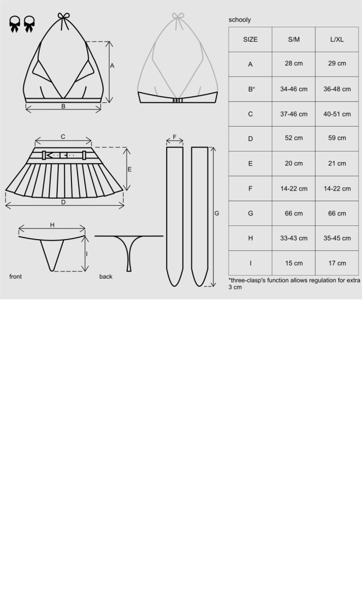 S/M: обхват під грудьми — від 68 до 92 см, висота чашки — 28 см, резинка спідниці — від 74 до 92 см, довжина спідниці — 20 см, обхват спідниці по низу — 52 см, резинка стрінгів — від 66 до 86 см, окружність резинки панчіх — від 28 до 44 см, висота панчохи — 66 см.