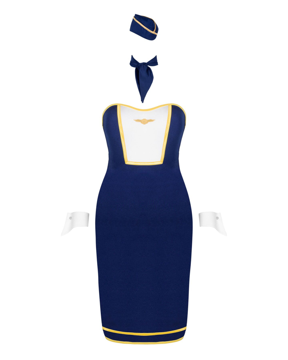 Синя сукня-бодикон спереду прикрашена білою вставкою із золотим оздобленням. Поділ сукні також декорований золотом. Значок із крильцями нагадує про належність прекрасної стюардеси до однієї з авіакомпаній. Ззаду сукня на шнурівці, що нагадує корсет. Елегантний шарфик красиво пов’язується на шию і має дуже стильний вигляд. Білосніжні широкі манжети з кнопками дуже зручно знімати й одягати навіть без сторонньої допомоги. Симпатична синя пілотка із золотим оздобленням надають образу натуральності та пікантності.