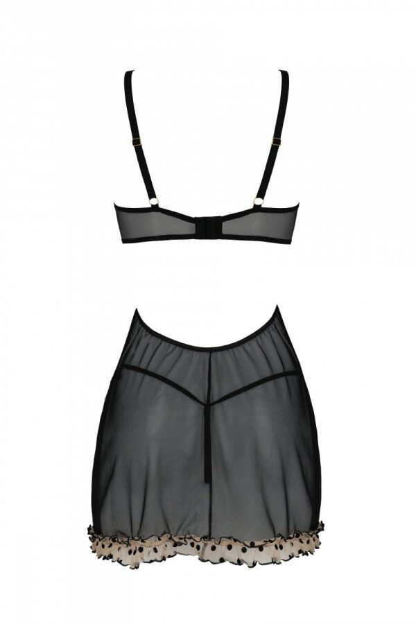Дрібна м’яка сіточка не приховує фігуру, а лише чарівно прикриває животик та попку. Бежеві акценти на дрібних чашках бра й рюшах на подолі пеньюара мають приголомшливий вигляд. Щоб еротичний пеньюар Passion MARINA CHEMISE сидів ідеально, повзунками можна відрегулювати довжину лямок. Ліф зручно застібається на спинці. У комплекті є маленькі стрінги.