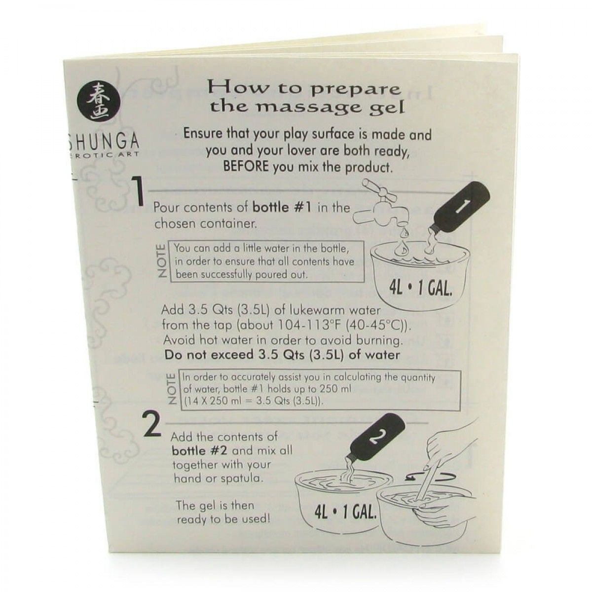 Для приготування суміші вам знадобиться 3,5 літри теплої води, з яких вийде 4 літри гелю. По черзі вилийте у воду обидва флакони з набору і добре перемішайте. Вуаля! Густий, неймовірно ароматний гель для кохання готовий. Скачайте 4 невисокі валики з ковдр або пледу і розподіліть по краях ліжка. Має вийти подоба невисоких бортів. Це потрібно для того, щоб під час процесу гель не розтікався, підтримуючи постійне ковзання. Поверх розстеліть золоте покривало і запрошуйте партнера випробувати незабутнє задоволення, яке запам'ятається вам надовго.