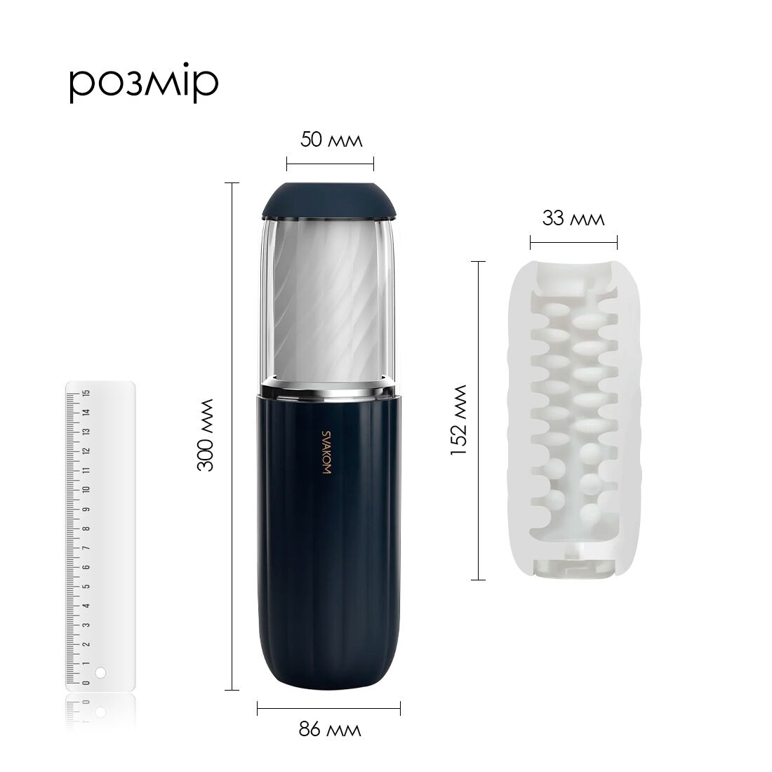 універсальний розмір внутрішнього рукава (довжина 15,2 см) дає можливість комфортно використовувати мастурбатор за будь-якого розміру пеніса;