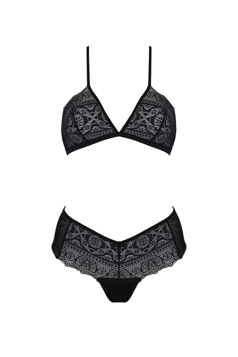 Чорна еластична, м’яка на дотик сіточка в цьому сеті доповнює оксамитове мереживо з візерунком із кругів і квітів. У бюстгальтері з ажурного полотна виконані м’які чашки з виточками, а в трусиках — передня панель, що прикриває живіт.