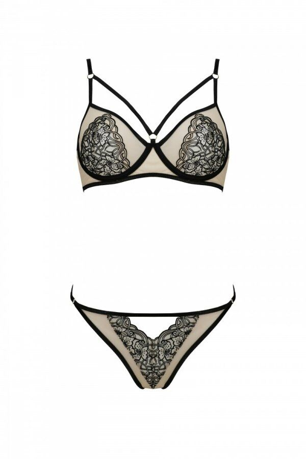 Рекомендуємо купити комплект Passion LORINA SET — ідеальну білизну незвичайного дизайну для інтимного побачення та на кожен день. Зверніть увагу на контрастні кольори, у яких виконано комплект Passion LORINA SET: на основному бежевому кольорі дуже добре видно вишукані візерунки розкішного мережива. Тонкі чорні стрепи підкреслюють ніжність та жіночність, виділяють груди та акцентують увагу на декольте.
