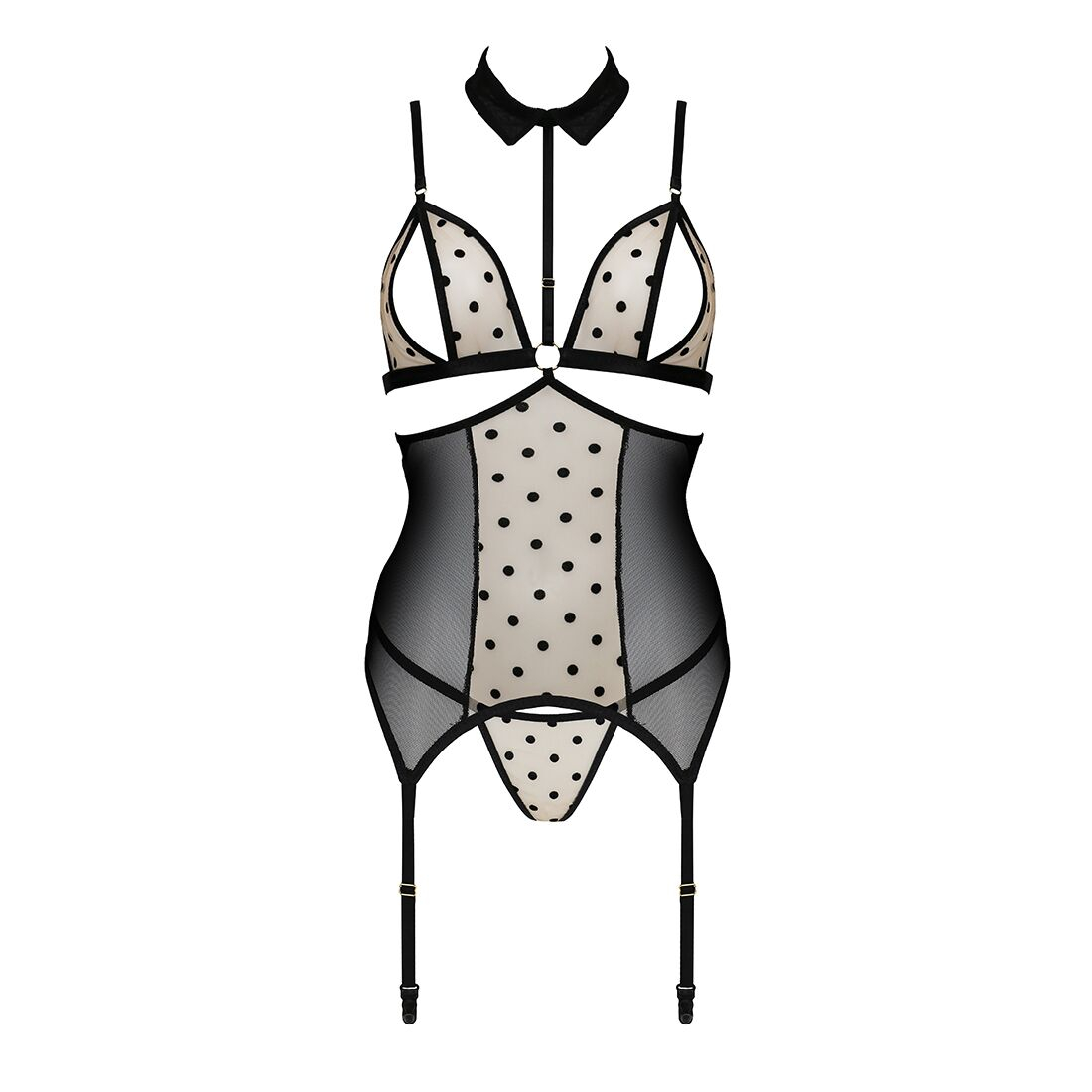 Модель боді з відкритими грудьми Passion DOMINICA CORSET виконана з прозорого матеріалу в горошок. Унікальний крій додає образу спокусливості, тому чоловік не зможе встояти перед вашим тілом. Плечові ремені та підв’язки регулюються, чашки комплекту м’яко відкривають соски. Просто надягніть його на себе, щоб вирушити у світ сексуальних експериментів.