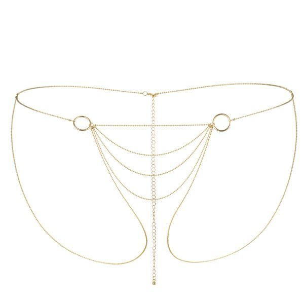 Ланцюжок-трусики Bijoux Indiscrets Magnifique Bikini Chain надасть сексуального відтінку будь-якому вашому вбранню. Благородний золотистий відтінок підійде і під пляжний лук, і під чуттєве еротичне вбрання, а також може посилити привабливість вашого оголеного тіла. Каскад із трьох тонких ланцюжків прикрашає зону промежини, а два ланцюжки позаду відтіняють красу попки. Завдяки двом симетрично розташованим кільцям можна легко відрегулювати посадку трусиків. Матеріал ланцюжка є гіпоалергенним і не містить нікелю. Виріб ідеально відполірований, тому не завдає незручностей, приємно відчувається на тілі й не залишає слідів на шкірі. Постачається в стильній та елегантній коробці зі щільного картону, тому прикраса може стати розкішним презентом.