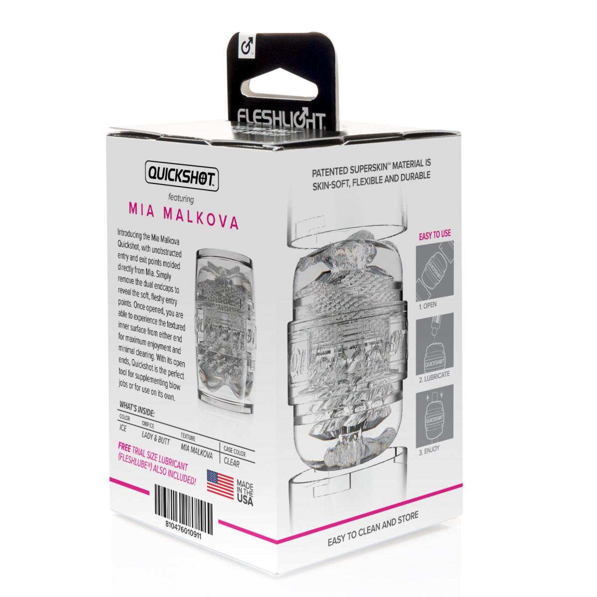 Корпус мастурбатора Fleshlight Quickshot Mia Malkova виготовлений з АБС-пластику. Іграшка багаторазова й потребує використання зі змазкою на водній основі. Після використання потрібно дістати рукав із корпусу, ретельно промити теплою водою та засобом для очищення інтимних іграшок. Обов’язково висушити насухо, обробити рукав відновлювальним засобом і вставити назад у корпус.