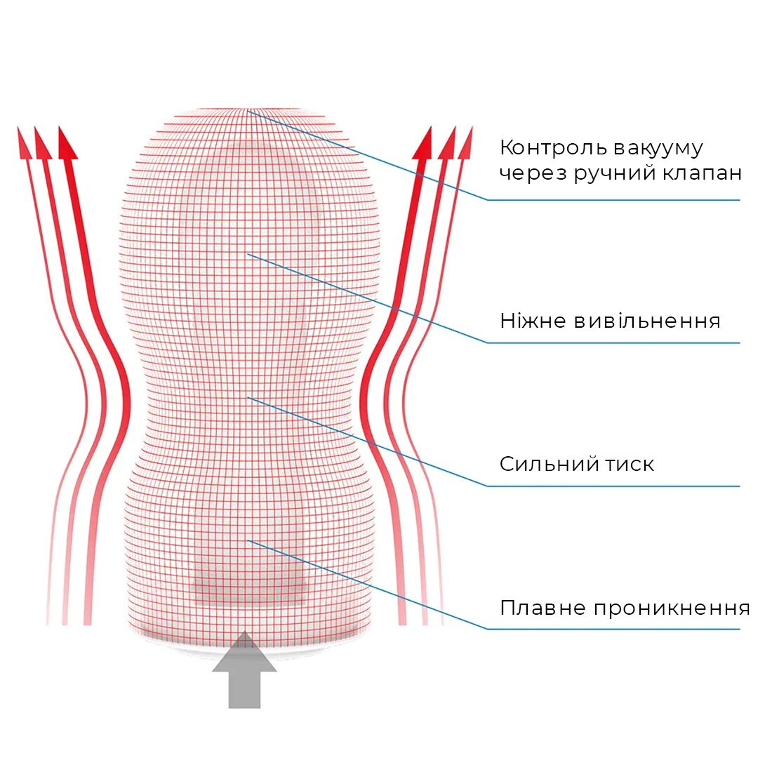 оснащений спеціальними камерами з клапанами, які під час використання мастурбатора створюють перепади тиску, забезпечуючи реальний ефект смоктання;
