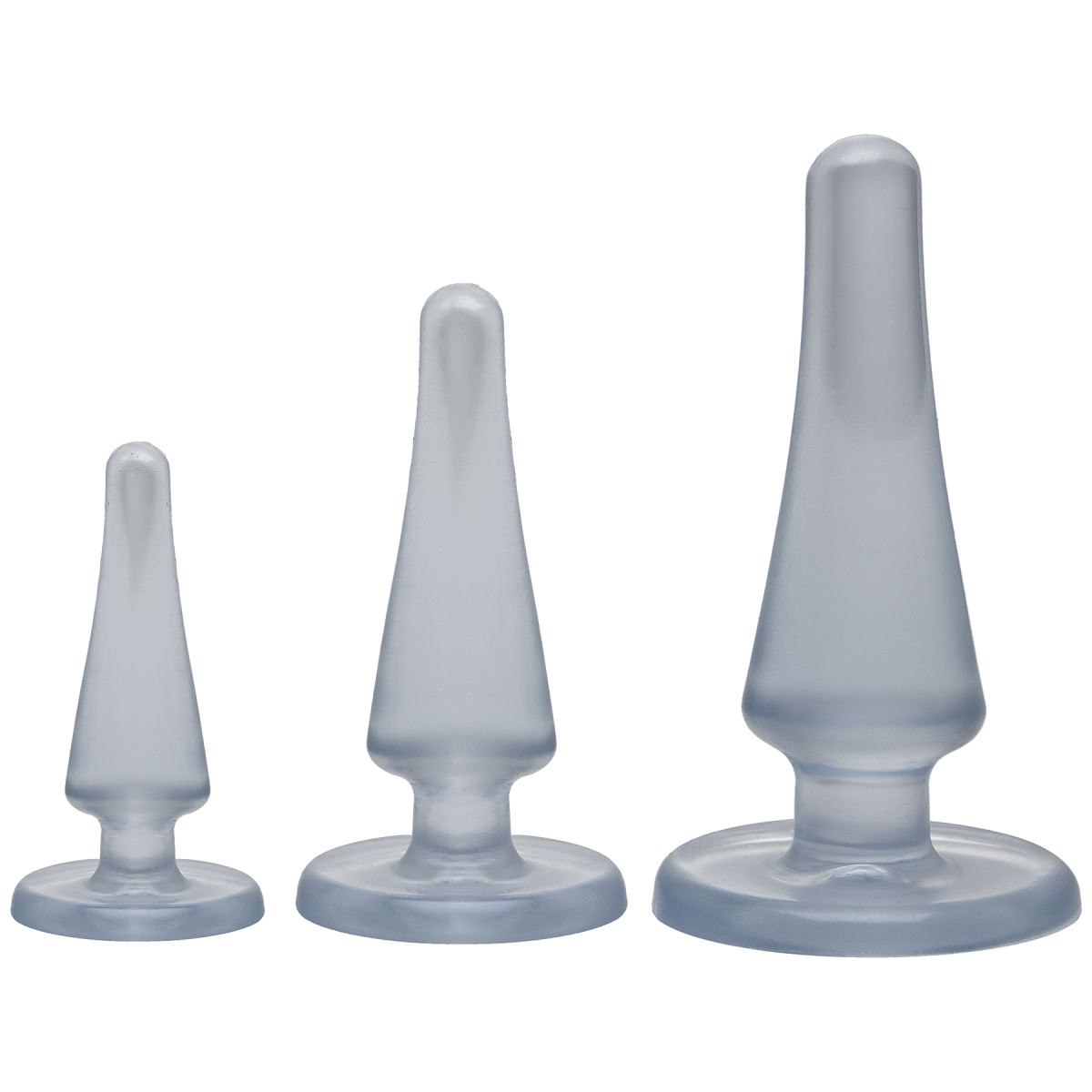 Пропонуємо придбати набір анальних пробок Doc Johnson Crystal Jellies Anal Initiation Kit. Стимулятори мають плоску основу, яка одночасно служить безпечним обмежувачем. Набір виконаний з сучасного гіпоалергенного матеріалу з додаванням антибактеріальної формули Sil-A-Gel. У наборі три класичні пробочки для анальної стимуляції. Форма конусоподібна, з безпечним розширенням до низу і обмежувачем. Цей набір ідеальний і для новачків, які тільки відкривають для себе світ анальних насолод, і для більш досвідчених партнерів - для стимуляції ануса перед сексом або використання під час класичної близькості. Анальні втулки виготовлені з приємного прозорого еластомеру, помірно пружні і гнучкі для комфортного введення.
