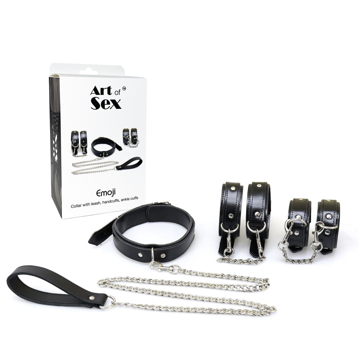 Оригінальний набір з трьох елементів Art of Sex - Emoji: нашийника з повідцем, наручників і поножів призначений для тих, хто бажає розширити свій досвід в інтимних відносинах та відчути неймовірну суміш влади, пристрасті та пригод. Всі елементи набору виготовлені з високоякісних матеріалів. Наручники та поножі забезпечують м'яку підтримку і комфортне прилягання до зап'ясть та щиколоток. Нашийник з металевим повідцем надійно фіксується на шиї і дозволяє керувати рухами партнера. Регульовані затягувальні ремені дозволяють вам налаштовувати ступінь фіксації для комфортного носіння протягом всієї гри.