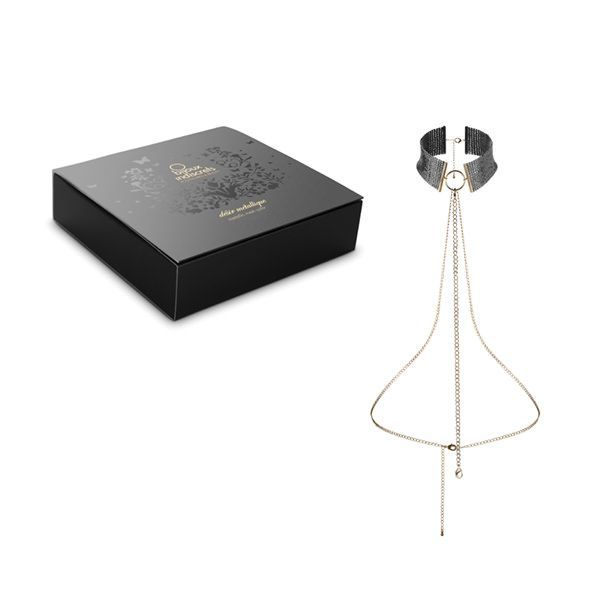 Дизайн намиста-коміра Bijoux Indiscrets Desir Metallique Collar, натхненний культурою БДСМ, додасть легкої грайливості в діловий стиль, витонченості — до вечірнього туалету, чуттєвості — в еротичний образ і пікантності — до абсолютної наготи. Комір-сітка ніжно обвиває шию, а два ланцюжки, що виходять із центрального кільця, вигідно обігрують жіночі вигини та хвильні груди. Посадку прикраси можна легко відрегулювати завдяки спеціальним карабінам, а подовжити виріб — за допомогою додаткового ланцюжка. Аксесуар можна використовувати як частину пляжного ансамблю, і як повноцінний еротичний костюм. Усе залежить лише від вашої фантазії. Матеріал ланцюжка є гіпоалергенним і не містить нікелю. Виріб ідеально відполірований, тому не завдає незручностей, приємно відчувається на тілі й не залишає слідів на шкірі. Постачається в стильній та елегантній коробці зі щільного картону, тому прикраса може стати розкішним презентом.