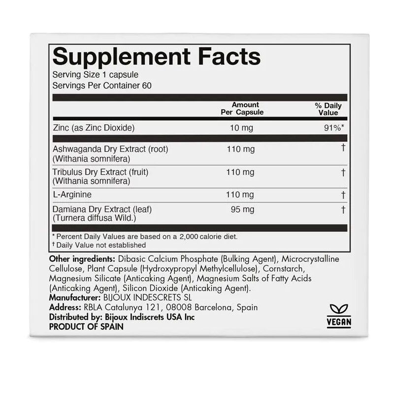 Основний склад: діоксид цинку, сухий екстракт кореня ашвагандхі, сухий екстракт плодів трибулуса земляного (якорців), L-аргінін, сухий екстракт листя даміани.