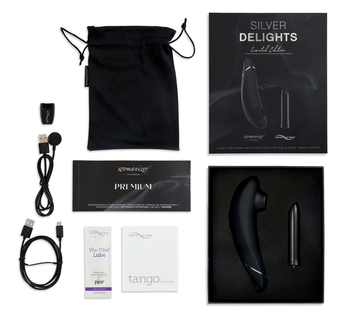У комплекті: вакуумний кліторальний стимулятор Womanizer Premium, насадка на розтруб розміру М, віброкуля We-Vibe Tango, USB-кабель, магнітний USB-кабель, мішечок для зберігання іграшок, пробник лубриканту на водній основі We-Vibe Lube від pjur 2 мл, короткий посібник та інструкція з безпеки.