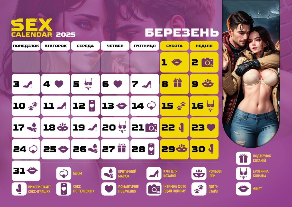 Не пропустіть шанс зробити інтимне життя більш яскравим! SEX КАЛЕНДАР — це можливість додати родзинку у кожен день всього року. День за днем, місяць за місяцем ви будете все ближче впізнавати один одного та насолодитеся безліччю еротичних експериментів. У СЕКС КАЛЕНДАРІ-2025 ви знайдете цікаву ідею на кожен день. Це може бути і романтичне побачення, і масаж інтимних частин тіла, і рольові ігри, і перегляд фільмів для дорослих. Завдяки календарю ви зможете спробувати нові сексуальні ігри та визначитися з улюбленими.