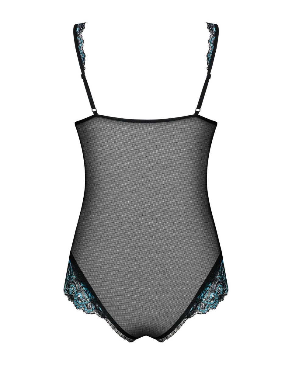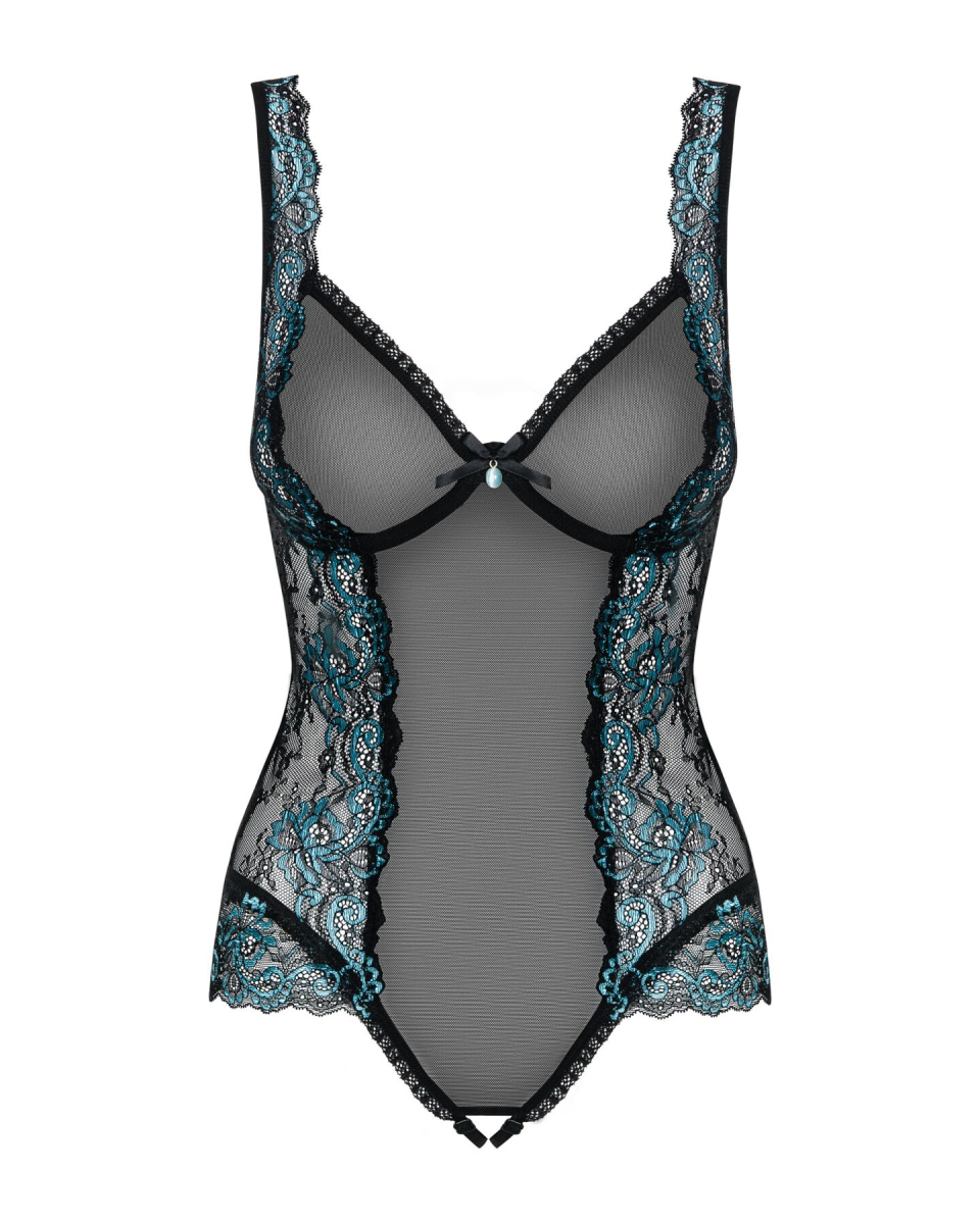 У чашки ліфа дуже вдало вшиті кісточки — це дає змогу підтримати і гарно окреслити груди. Прикрашені мереживом регульовані бретелі можна відкоригувати по довжині для більшої зручності та кращого прилягання. Кулон-прикраса між грудьми притягує погляд і ніби просить торкнутися та пестити. Широкі вставки з шикарного мережива з боків візуально роблять силует стрункішим. Чорний колір майстерно сплітається з ніжно-блакитним, підкреслюючи та виділяючи витончений малюнок вишуканого мережива. Найтонша ніжна сіточка лягає на тіло, еротично його прикриваючи, але залишаючи можливість розглянути всі пікантні деталі і особливо неоднозначний натяк на відкритий промежину з регульованими еластичними ремінцями.