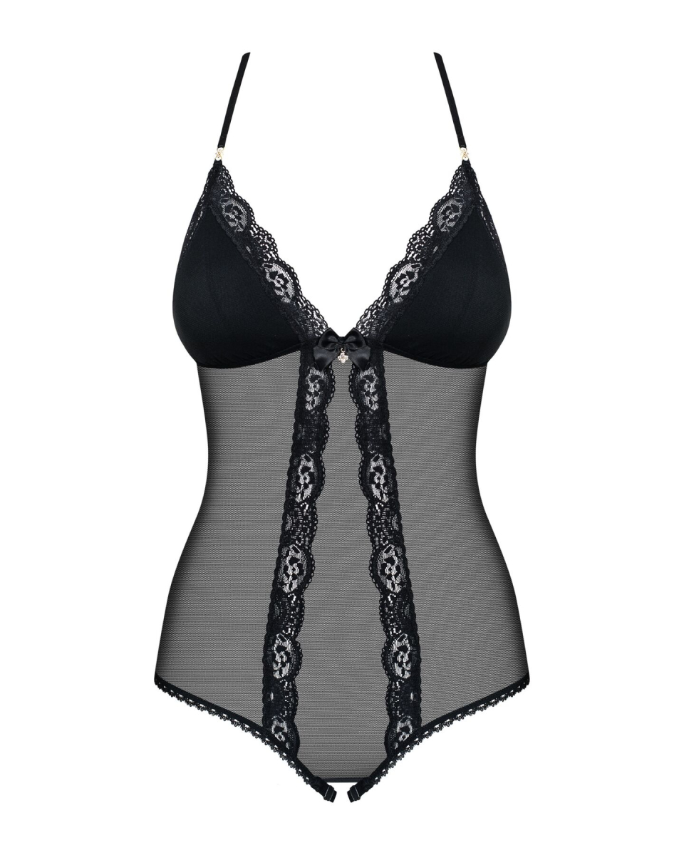 Невагома еластична сіточка другою шкірою обтягує живіт та спинку. М’які трикутні чашки підтримують та підкреслюють груди. Прикрашає боді приголомшливе квіткове мереживо, що широкими смугами лягає на ліф, уздовж тіла до відкритої промежини. Ззаду це ж мереживо красиво описує вигин спини і сідниць. М’які ремінці інтимного вирізу можна відрегулювати під себе. Еластичні, перехрещені на спині бретелі можна легко відрегулювати під особливості своєї фігури. Блискучі прикраси на бретелях і між грудьми та атласні бантики під грудьми та над вирізом ззаду додають боді легкого шику та пікантності.