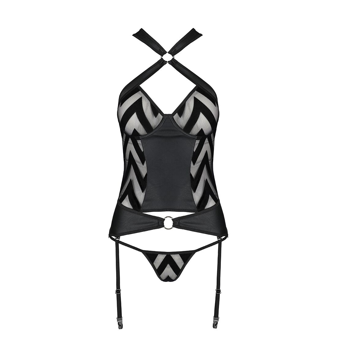 Сітчастий комплект із візерунком Hima Corset black L/XL - Passion, корсет з халтером, підв'язки, трусики: