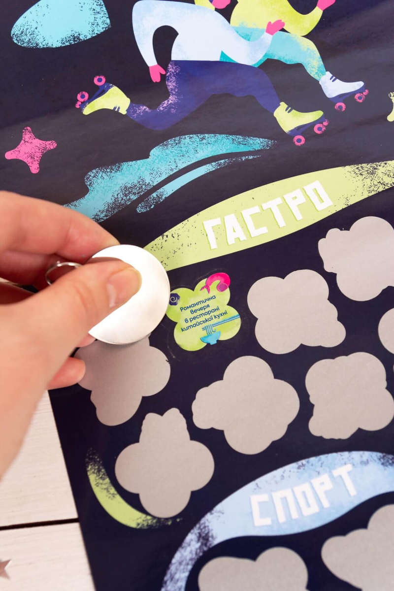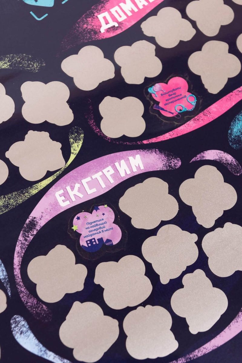 Опис: Якщо ви шукали спосіб доповнити або прикрасити свої стосунки, ви його знайшли. Ми створили для вас скретч-постер побачень. Тепер вам не потрібно «сушити» голову над тим, куди піти або як порадувати свою половинку ? ми про все подбали за вас. Усі побачення поділені на кілька категорій: просто виберіть, яка з них сьогодні вам більше до вподоби, а решту вже визначить випадок. Стирайте захисне покриття та насолоджуйтесь часом, проведеним разом!