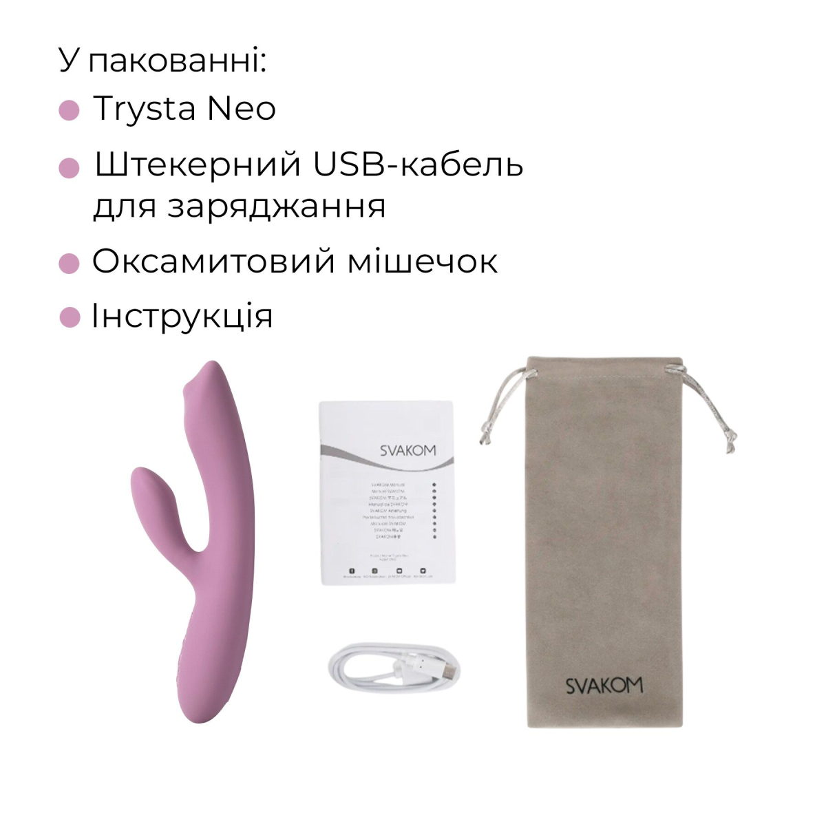 Максимум можливостей вібратора-кролика з перлинною стимуляцією точки G Svakom Trysta Neo відкривається під час синхронізації зі смартфоном. Працює з двома безкоштовними застосунками, Svakom та Feel Connect (QR-код для завантаження можна знайти в інструкції до вібратора, а також завантажити застосунки безпосередньо в App Store або Google Play).