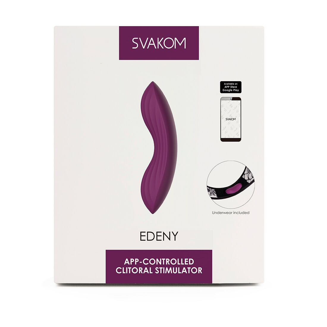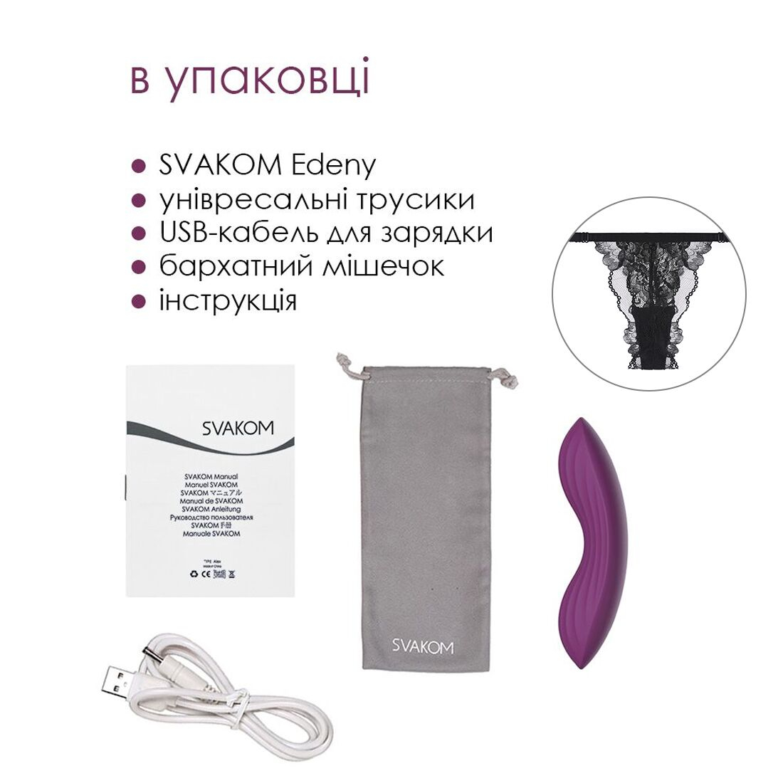 У пакованні: SVAKOM Edeny + оксамитовий мішечок + трусики + інструкція + USB-кабель для заряджання.