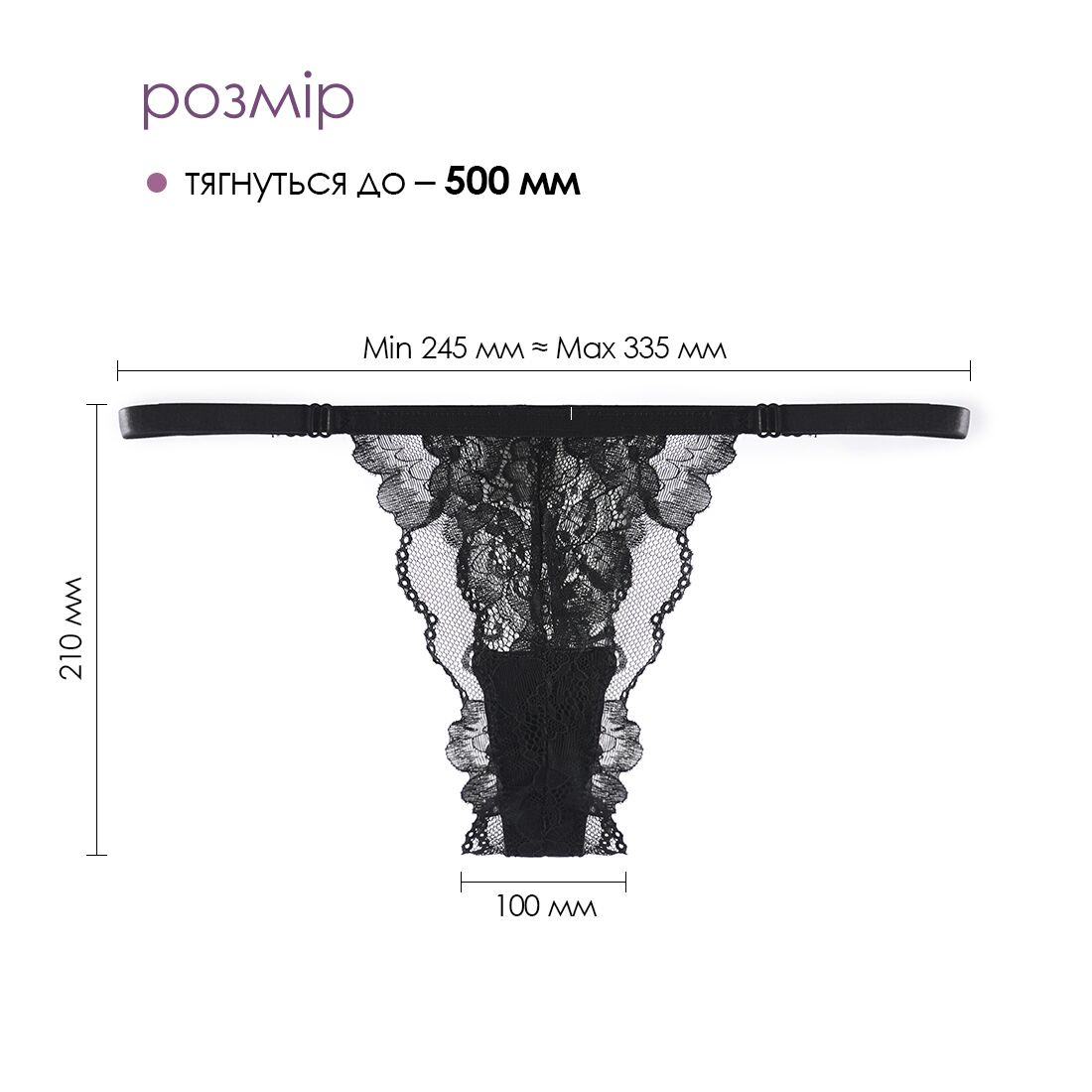 Розміри трусиків: мінімальна ширина резинки 24,5 см, максимальна — 33,5 см (тягнуться до 50 см); висота трусиків 21 см, ширина ластовиці 10 см.
