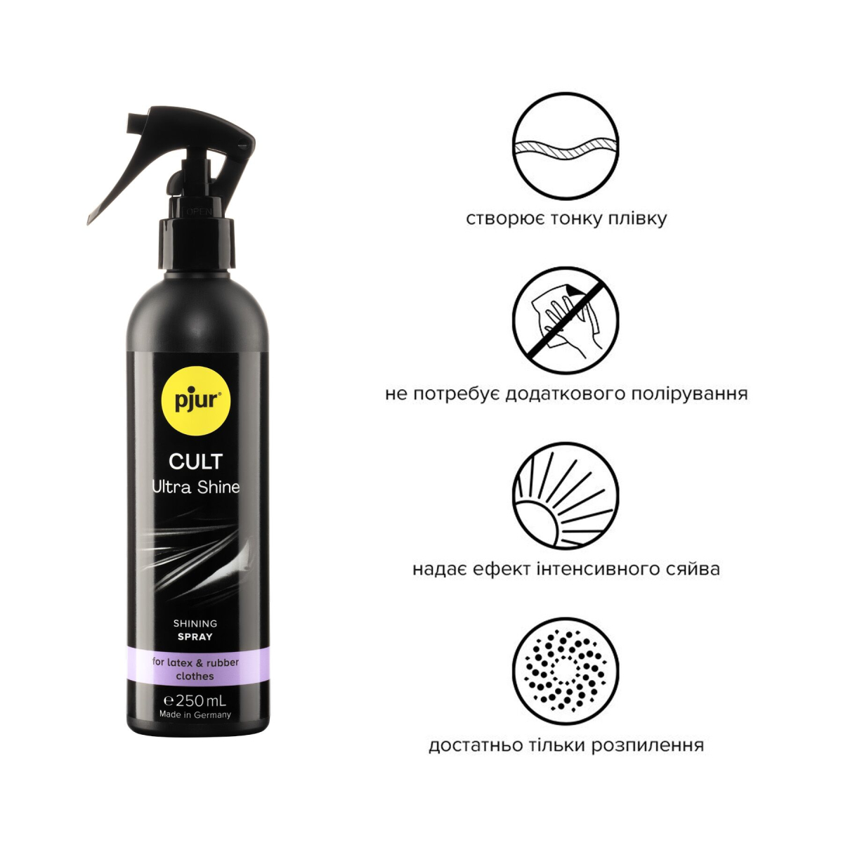 Спрей для латексу pjur Cult Ultra Shine упакований у зручний флакон, яким легко користуватися. Для використання розпорошіть засіб на одяг із латексу, дотримуючись відстані 30 см. І, як результат, сліпучий блиск без додаткового полірування.
