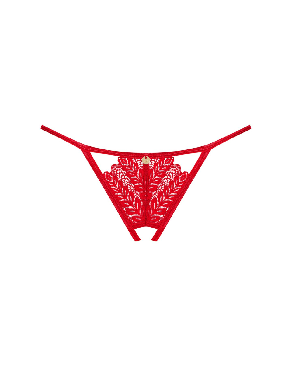 Трусики пошиті із тонких еластичних стрепів червоного кольору. Передня та задня частини виконані з сіточки з листяною вишивкою. Маленький золотистий кулончик із логотипом виробника привертає погляд до низької посадки стрінгів. Відкрита промежина — головний нюанс: симпатична білизна може залишатися на вас до та під час інтимних ігор.