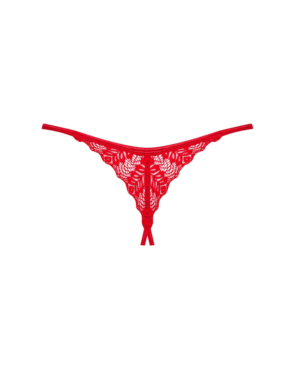 Трусики пошиті із тонких еластичних стрепів червоного кольору. Передня та задня частини виконані з сіточки з листяною вишивкою. Маленький золотистий кулончик із логотипом виробника привертає погляд до низької посадки стрінгів. Відкрита промежина — головний нюанс: симпатична білизна може залишатися на вас до та під час інтимних ігор.