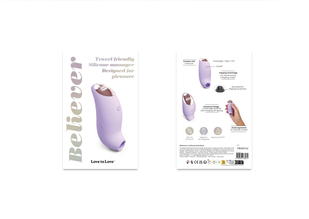 Цей симпатичний малий дасть вам сміливість дослідити найніжніші частини вашого тіла, експериментуючи із захоплювальними враженнями дух. Рекомендуємо купити вакуумний кліторальний стимулятор Love To Love BELIEVER. Його ергономічний корпус із м’якого силікону зручно лягає в долоню. Ніжний обідок мембрани дбайливо обіймає клітор і ритмічно рухається вгору-вниз і вперед-назад, солодко дражнячи й стимулюючи горбок бажання. У стимулятора є п’ять режимів вібрації, їх можна міняти натисканням на кнопку. Стимулятор водонепроникний, тому ви можете сміливо брати його із собою в душ або ванну. А компактний розмір іграшки просто кричить про готовність вирушити з вами у відпустку. Щоб девайс не ввімкнувся у валізі, його можна заблокувати на час польоту або поїздки. Або, можливо, ви хочете взяти іграшку в офіс і тихо усамітнитися з нею в дамській кімнаті?