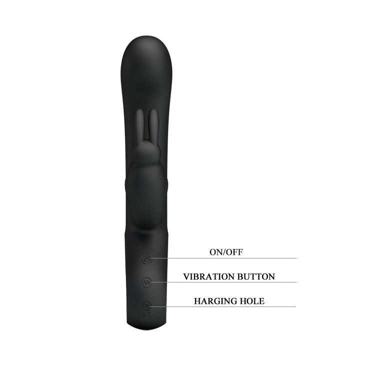 Вібратор чорного кольору, виготовлений в елегантному дизайні з високоякісного силікону з бархатистою поверхнею. Має загнутий голівку для прямої стимуляції точки "G" 12 та кліторний відросток у вигляді кролика. Оснащений 12 режимами вібрації, якими легко керувати за допомогою кнопок на основі. Рекомендується використовувати з лубрикантом на водній основі.