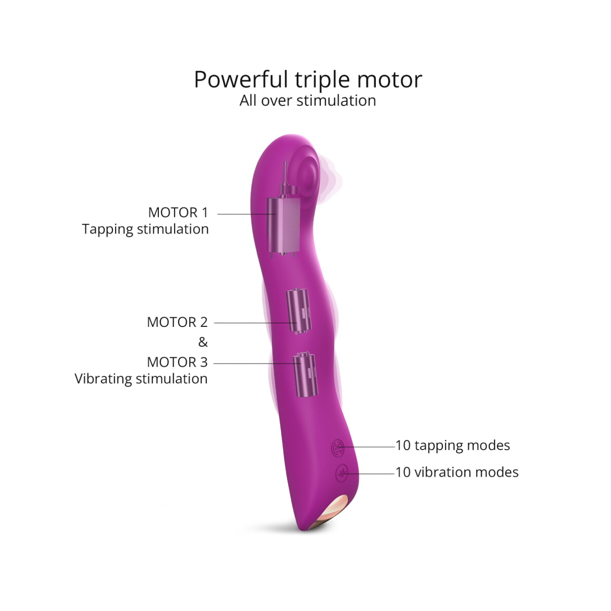 • три мотори: два відповідають за вібрацію в нижній частині вібратора (керуються синхронно), один — за пульсацію перлини для стимуляції точки G (окреме керування);