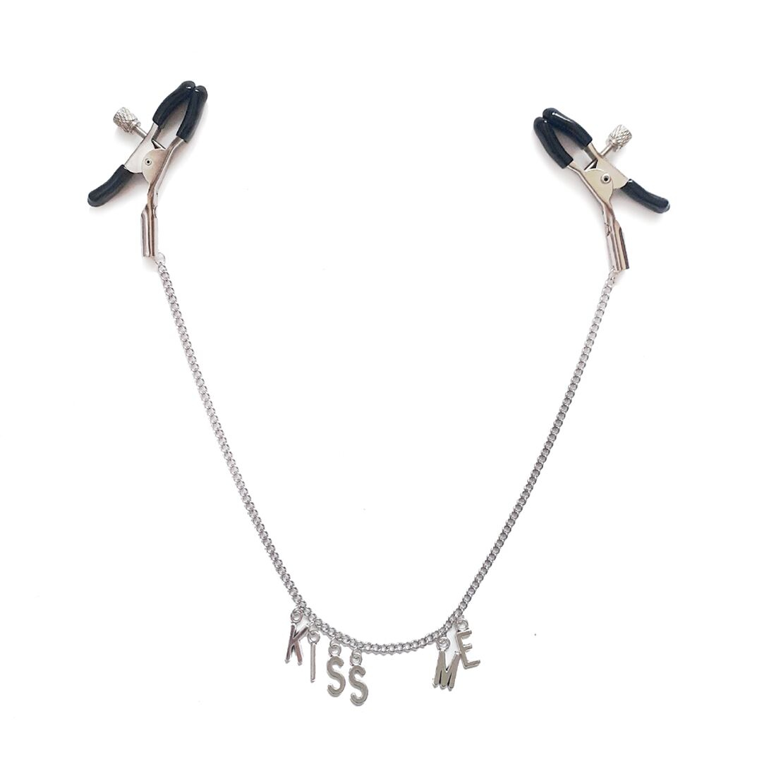 Затискачі для сосків на ланцюжку Art of Sex - Nipple clamps Kiss Me - Затискачі для сосків, які скажуть все за вас. Металеві затискачі з силіконовими накладками для безпечного використання додатково оснащені регуляторами для зміни сили натиску на ваш смак. Затискачі з'єднані між собою тонким ланцюжком із призовною підвіскою Kiss me. З цими затискачами ваш партнер зрозуміє будь-який натяк.