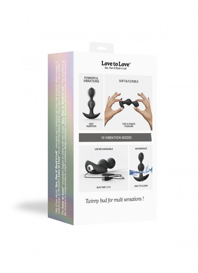 У анального стимулятора Love To Love TWINNY BUD кульки щільні, але не жорсткі, злегка пружні, що ідеально для початківців. Після повної зарядки буде працювати до 90 хвилин.