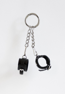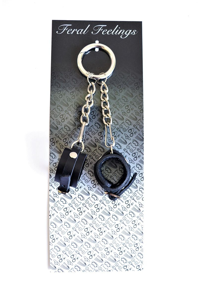 Мініатюрна версія наручників виготовлена ??з натуральної шкіри рослинного дублення. Кожен наручник кріпиться до основного кільця-карабіну ланцюжком і міні-карабіном, тому можна носити тільки один наручник, а другий - подарувати своєму партнеру у якості символу.