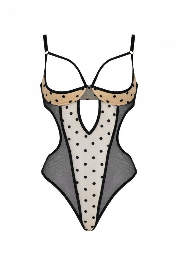 Рекомендуємо купити еротичне боді Passion MARINA BODY з відкритим бра. З боків і на грудях боді виконано з м’якої дрібної сіточки комбінованих кольорів — чорного та бежевого. Клиноподібна вставка від грудей до промежини — з прозорої сіточки у великий горох додає еротизму. Але, звичайно, родзинка цього приголомшливого боді — це відкриті чашки бра.