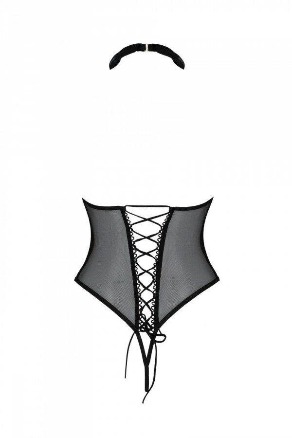 Еротичне боді Passion TRISHA BODY пошито з тонкої м’якої сітки комбінованих кольорів — бежевого в горошок на животику та чорного з боків. Боді закриває тіло до грудей. Симпатична деталь — сорочковий комір на тонкому регульованому стрепі, що йде від верхнього краю боді між грудьми до шиї. Спинку боді прикрашає корсетна шнурівка. З її допомогою можна легко відрегулювати білизну під особливості фігури. Оголені сідниці додають інтриги та збудження і без того розпаленому шикарним виглядом тілу. Будьте впевнені, ваш партнер високо оцінить таке вбрання для інтимного побачення.