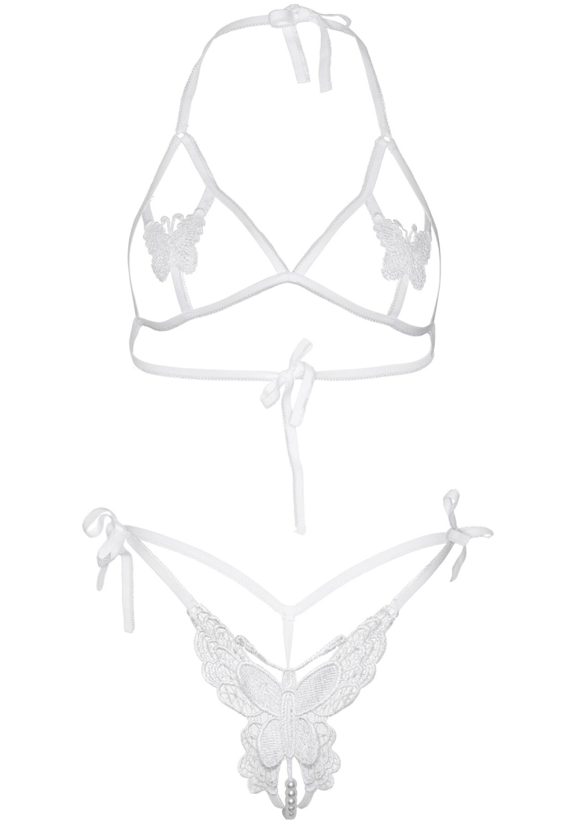 Цей шикарний комплект зовсім не про скромність. Він створений спокушати, манити та дозволяти. Пошитий з еластичних ремінців і прикрашений філігранно виконаними метеликами, еротичний комплект з відкритою чашкою Leg Avenue Open cup bra and pearl panty не залишить байдужим ні вас, ні вашого партнера. Звична чашка грудей у ??цьому комплекті складається лише з трьох еластичних стреп, оголюючи груди. Два симпатичні метелики злегка прикривають соски. Позаду стрепи можна зав’язати, у такий спосіб відрегулювавши ліф за своєю фігурою. Крихітні стрінги із зав’язками з боків, спереду прикрашені метеликом, який лише частково прикриває низ живота. Ніжні місця сексуально прикрашає перлинна нитка. Ця деталь має неймовірно еротичний і манливий вигляд.