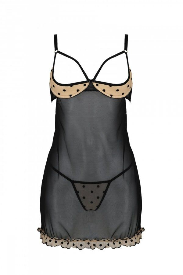 Дрібна м’яка сіточка не приховує фігуру, а лише чарівно прикриває животик та попку. Бежеві акценти на дрібних чашках бра й рюшах на подолі пеньюара мають приголомшливий вигляд. Щоб еротичний пеньюар Passion MARINA CHEMISE сидів ідеально, повзунками можна відрегулювати довжину лямок. Ліф зручно застібається на спинці. У комплекті є маленькі стрінги.