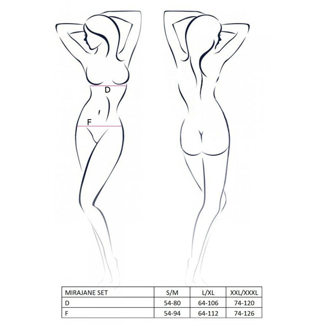 Набір Mirajane - це інноваційна комбінація тонкої сітки з еластичною гумою з логотипом Passion. Оригінальний крій підкреслює бюст, а ремінець відкритого типу - пряне доповнення до набору. Mirajane був створений у першу чергу для жінок, які цінують комфорт, високу якість і оригінальний зовнішній вигляд.
