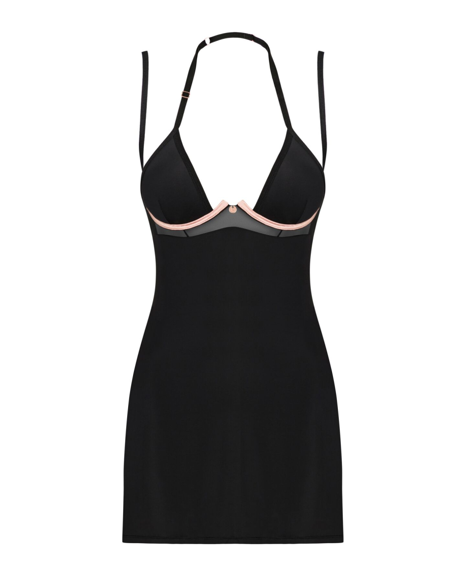 Сорочка від бренду Obsessive з непрозорого чорного матеріалу чудово підкреслює фігуру. Акцентом вбрання є гарний дизайн бюста. Чашка частково відкрита з боків, має рожеві кісточки, дуже добре підтримує груди завдяки подвійним регульованим бретелям і багатоступеневій застібці ззаду. Привертає до себе увагу маленька підвіска з рожевого золота, на якій зображено логотип бренду. Сорочка укомплектована стрінгами із низькою посадкою.